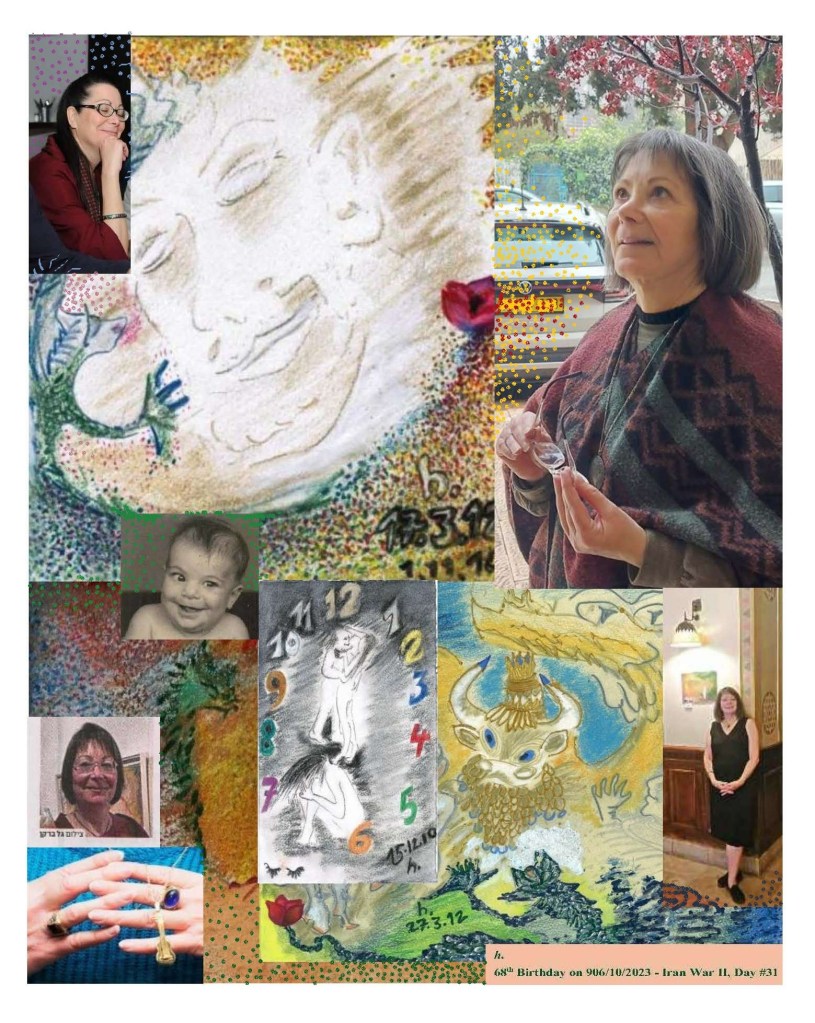 בֵּין המילים שֶׁחָבְרוּ זו אל זו לקראת יום הולדתי שֶׁלִּפְנֵי-הַקּוֹדֵם, רואה כי כתבתי אודות הַקּוֹלָאז’ שֶׁהֶחְלִיט אז מִדַּעֲתוֹ-שֶׁלּוֹ לְהֵעָשׂוֹת בתהליך של קיטום וְהַכְלָבָה של פיסות מתוך יצירות שלי, כאשר מתוך הַחֲשֵׁכָה הַסְּמִיכָה שֶׁלאחר הִתאלמנוּתִי חזרתי לְצַיֵּר וְלכתוב פְּרוֹזָה וְגם שירה, יחד עם תצלומים שלי – אחד עכשווי בִּירושלים סמוך לאותו יום הולדת וְאחד מִשְּׁנַת אַלְפַּיִם-וּשְׁתַּיִם בחצר בֵּיתִי בְּגבעתיים: “… זאת הַפַּעַם אֵין לנסות לאחות אֶת חֶלְקֵי הפיסות לכלל מַרְאֶה שלם, כי הִתְרָאוּת כזאת לא אמיתית תהיה…”. וְהַפַּעַם כְּשֶׁחזרתי מֵהַמספּרה, אֵלֶיהָ הִגעתי סְפוּגַת מֵי גשם, הָאזעקה שֶׁהוּשמעה כְּרֶגַע לְאַחַר שֶׁירדתי מֵהָאוטובּוס וְחציתי את הַכְּבִישׁ מאיימת, וַאֲנִי אומרת לעצמי חֶרֶשׁ, “כבר מגיעה. יציבה וּבטוחה. נשארת יציבה”, וּבחרתי מִבֵּין הַתצלומים שֶׁגַּם הַשָׁנָה צִלֵּם אותי ליאור מִצוות הַמספּרה את הָאחד בו נקלט בְּעֵין הַמצלמה מַבָּטִי הַפּוֹנֶה פְּנִימָה; וְידעתי כי גַּם הַשָׁנָה, כמו בַּקּוֹלָאז’ים מֵהַשָׁנים הַקודמות, מתבקש עיבוד של צילום מִיּוֹם פתיחת הַתערוכה לְזִכְרוֹ הָאָהוּב של אלן שלי, וְגם אותה תזכּורת מֵ”אלבּום הַתינוקת” שֶׁהֵכִין וְשָׁמַר אבי, צילומים של אותה בת חמישה-חודשים, ניצוץ בְּעֵינֵיהָ וְחִיּוּכָהּ אומר תקווה; אבל גיליתי להפתעתי כי הַשָּׁנָה סרב הַקּוֹלָאז’ לכלול כל תזכּורת מִשמונה הַשָּׁנִים הַמאושרות בְּחַיַּי אותן זכיתי לחלוק עם אלן שלי, לא תמונה מֵחתונתנו וְלא תמונות מֵרִגְעֵי-בְּיַחַד אחרים של שְׁנֵינוּ; מִדַּעֲתוֹ-שֶׁלּוֹ הֶחְלִיט הַקּוֹלָאז’ לנוע מֵהַתינוקת של שְׁנַת אלף תשע מאות חמישים וּשמונה אל הָאלמנה הָעורכת “אייריש ווייק” לָאִישׁ שֶׁלָּהּ בַּשבעה בְּמרץ אַלְפַּיִם-וְאחת-עֶשְׂרֶה, בסיום אירוע פתיחה של רטרוספקטיבה שֶׁל הָאמנות שֶׁלּוֹ כְּשֶׁמָּלְאָה הַשָּׁנָה הָראשונה לְהֵאָסְפוֹ