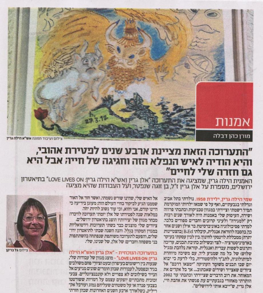 וּמִשָּׁם לְדַלֵּג שלוש שנים אל פתיחת הַתערוכה הַמשותפת הָראשונה של שְׁנֵיהֶם, אותה אלמנה נפעמת כאשר תיאטרון ירושלים שב לְאָרֵחַ יצירות של הָאִישׁ שֶׁלָּהּ וְזאת הַפַּעַם לצד אֵלּוּ גם יצירות שֶׁלָּהּ-עַצְמָהּ