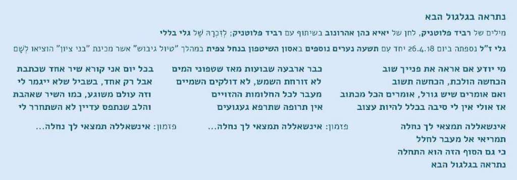 מתי הִשתתקוּ הַבַּקָּשׁוֹת? כבר זמן נִכָּר שֶׁאֵינִי שומעת אותן. תשע מאות וְשישה ימים מחרישים את בַּקָּשׁוֹתַי. אש וְדם וּדמעות, צער וּכאב וְחרון, וְאֵימָה גדולה מאוד, וְהָרַע הִנֵּה הולך וּמתעצם כבר שלושים וְאחד ימים. איך יכולה אישה לשמוע את בַּקָּשׁוֹתֶיהָ שֶׁלָּהּ-עַצְמָהּ בָּרַעַשׁ הַמחריש הַזֶּה, של אֵימָה וּכאב, של צער וְחרון? אולי הַקּוֹלָאז’ הַפַּשְׁטָנִי הַזֶּה, תִּפּוּרָיו מתריסים כנגד כל ניסיון טִשטוּש, מבקש לְהַזְכִּיר לי: הַתערוכה הַשלישית הֲרֵי כבר הוֹדיעה לי את שְׁמָהּ וְאולי (כנראה?) עֲדַיִן מְחַכָּה לְהִתְמַמֵּשׁ; הַסְּפָרִים כבר רמזו לי את שְׁמוֹתֵיהֶם וְאולי (כנראה?) עֲדַיִן מְחַכִּים לְהִתְמַמֵּשׁ; הָאִישׁ הַמיועד לִשְׁאֵרִית חַיַּי, שֶׁאֲנִי מיועדת לִשְׁאֵרִית חַיָּיו, אולי כבר מבקש לַחֲבוֹר אֵלַי, למצוא איתי נחלה. גם הַשָּׁנָה מצרפת ל”פוסט יום ההולדת” את נתראה בגלגול הבא של רביד פלוטניק וְיאיא כהן אהרונוב. כמו הַקּוֹלָאז’, שורות הַשִּׁיר הַזֶּה אולי (כנראה?) עֲדַיִן אומרות לי: אינשאללה תמצאי לך נחלה | תמריאי אל מעבר לחלל | כי גם הסוף הזה הוא התחלה | נתראה בגלגול הבא