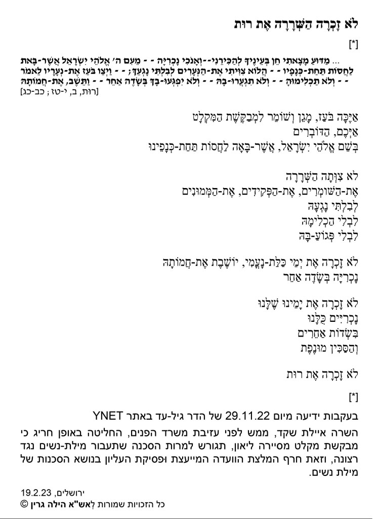 זה היה בְּסוֹף אוקטובר הָאחרון, אַחֲרֵי הניתוח הַלִּפְנֵי-אחרון כְּשֶׁאָז כלל לא הֶעליתי בדעתי כִּי עוד לְפָנַי ניתוח אַחֲרָיו שֶׁיִּדָּרֵשׁ בעקבות אותו איתות מְאַיֵּם מֵהַיְקוּם, שֶׁאָמְנָם – כמו שֶׁמֵּאָז אֲנִי אומרת, יצאתי באזהרה בלבד אבל זה היה ממש קרוב וְלא אכחד: מפחיד וְגם קשה – כְּשֶׁלְּפֶתַע לכד אותי הַשִּׁיר הַזֶּה, שֶׁנשמע בָּרדיו במונית, בדרך אֶל נו”ן וְהִבחנתי בו בעצם רק מֵהָאמצע, וְגם הַנהג לא הִכִּיר וְלא ידע לומר לי מיהו הַזַּמָּר אשר בְּמִלִּים שֶׁכְּמוֹ מעביר מִמְּךָ, אהובי שֶׁבְּכֹל מִשְׁכֵי הַחַיִּים, מוֹסֵר “… כי גם הסוף הזה הוא התחלה“וּמַבְטִיחַ לי “נתראה בגלגול הבא“, וְאומר לי: עד אז, “תמצאי לך נחלה“; עד שֶׁנכנסתי לַפּגישה עִם נו”ן הִספּקתי למצוא בַּגוּגל כִּי זה שיר שֶׁכָּתַב רביד פלוטניק לְזִכְרָהּ שֶׁל גלי בללי – אחת מֵהָעֲשָׂרָה שֶׁנִסְפּוּ בַּאסון נחל צפית; שׁוּם דבר שֶׁקשור אֵלֵינוּ, בעצם