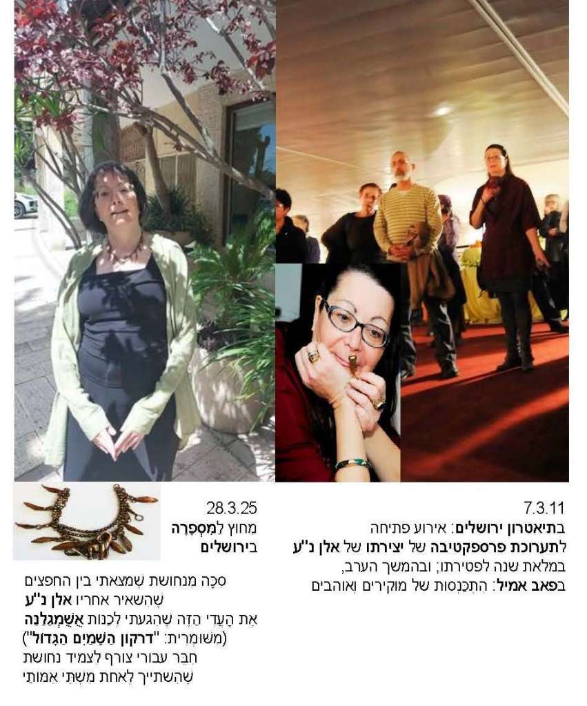 אבל עֲדַיִן גם נו”ן אושש אֶת הַמֶּסֶר: כן. שׁוּם סוֹף איננו סוֹפִי וְגם הַפֵּרוּד בְּמֶשֶׁךְ הַחַיִּים הָאחרון שלנו בְּעוֹלַם הַמְּמַדִּים הַסּוֹפִי שֶׁמחר יִמְלְאוּ 67 שְׁנוֹת-אֶרֶץ לְהַגָּעָתִי אֵלָיו, הוא רק אבן אחת מֵרַבּוֹת עַל-פְּנֵי הַגֶּשֶׁר הַמְּחַבֵּר בֵּין שְׁנֵינוּ מֵעֵבֶר לַחַיִּים וְלַמָּוֶת, בָּאֵיןמֵמַד. וְאכן, עוֹד נָשׁוּב וְנִתְרָאֶה, כְּשֶׁיּוּשְׁלַם הַמֶּשֶׁךְ הַנוכחי. אלא שֶׁבֵּינַתַיִם, כך הִדגיש נו”ן, אֵין אתה חָדֵל מִלְּהַפְגִּיעַ בי לבחור בַּחַיִּים, לאורך כֹּל הַשָׁנִים מֵאָז נָסַקְתָּ אֶל מִשּׁורֵי הִתְקַיְּמוּת עליונים, בְּעוֹדִי נוֹתֶרֶת סרבנית פְּרֵדוֹת עִקֶּשֶׁת וּמַמְרָה על אף כֹּל אשר שָׁלַחְתָּ בְּיַד מוֹסְרֵי דְּבָרֶיךָ גם כְּשֶׁמְּאַרְגֶּנֶת בִּדמעות רטרוספקטיבה שֶׁל הָאמנות שֶׁלְּךָ כְּשֶׁמָּלְאָה הַשָּׁנָה הָראשונה לְהֵאָסְפְךָ, לִכְבוֹדְךָ מְכַנָּה אֶת התערוכה לְזִכְרְךָ הָאָהוּב