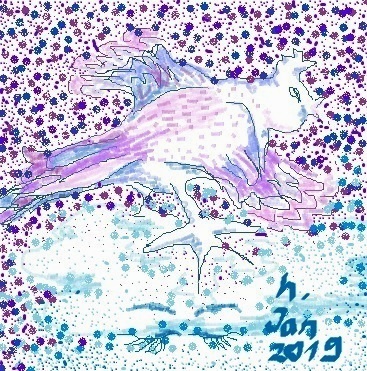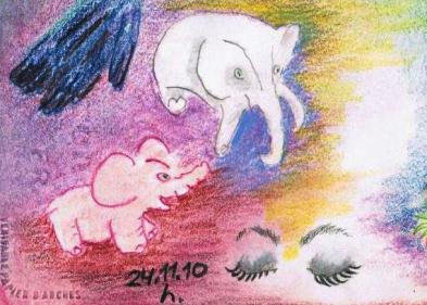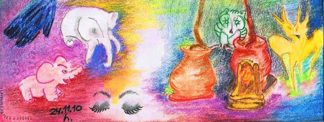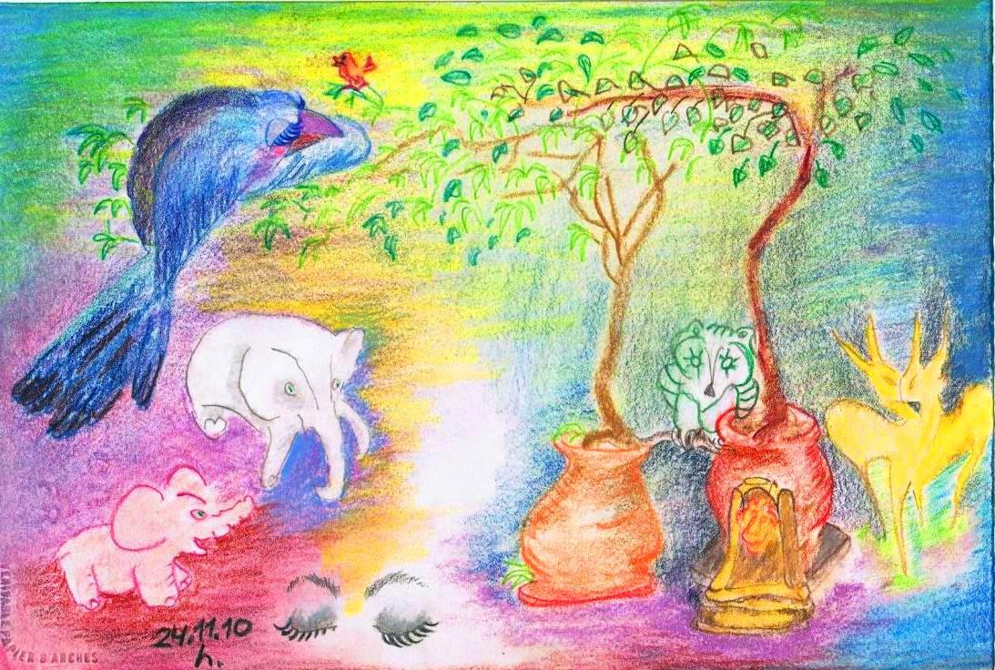 ביום 24.11.10 ציירתי, וכתבתי: אל חלומהּ של הַצפּוֹר הסגולה נִקראוּ וּבָאוּ כל החיות מהמדף בכוננית הספרים שלנו, אֲהוּבִי. הפילים שֶׁלְּךָ הִתערבּבוּ עם פִּילוֹתַי, והצבי מצא את בחירת לִבּוֹ. הקפה השחור עזר, הֵעִיר הינשוף שֶׁלְּךָ לתגליף האריה באבן שמצאתָ והתעקשתָ להציב בסלון, נודדת עם עֲצֵיךָ שבעציצים איתנו מדירה אל דירה. הָעֵצִים התאוששו פְּלָאִים. אבל תמשיכי לדבּר איתם, ולהפציר בהם לִחְיוֹת, לְזֵכֶר אַהֲבָתוֹ, מְזַמֶּרֶת סגולת הכּנף בַּחֲלוֹמְךָ. ואת חלומותַי אתה שָׁב וּמַשְׁכִּיחַ ממני לפני הִתְעוֹרֵרִי, שֹׁרֶשׁ נִשְׁמָתִי. מֵגֵן הוא ושוֹמֵר עָלַיִךְ, הרֵי גם אַתְּ יודעת זאת, אומרת לי הַלֶּהָבָה הסגולה. הס, אתה אומר לה. אַתְּ יודעת שאסור לגלות