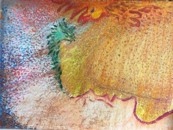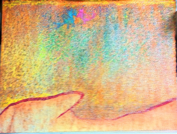 קטע מתוך ציור מיום 15.12.10. פחם יחד עם עפרונות דיו צבעוניים, וגם צבעי גיר. כאן – רוב החלק שבפחם עם נגיעות זהב וכסף