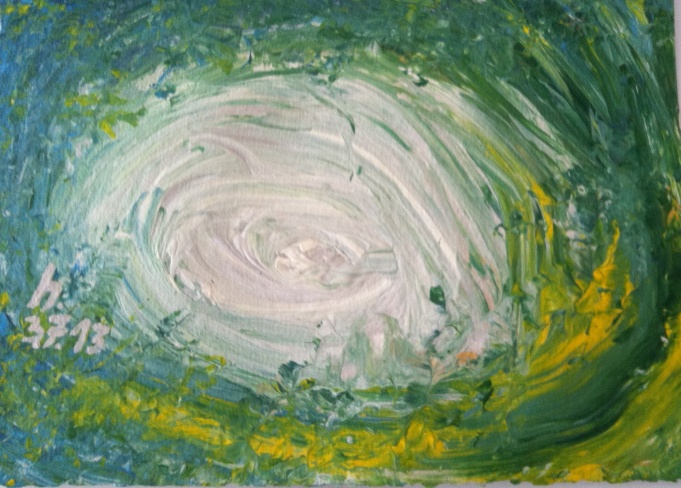 ביום 16.5.11 “קטמתי” פיסה מהציור, וכתבתי: ואת הציור כולו ציירתי עוד בנובמבר. למילים אחרות. ואחר כך קטמתי ממנו את הפיסה הזאת שלא התחברה מֵאז. ואני פיסות ונתזים שהתפזרו כבר, וחוטֵי מילים אוחזים את הרֶסֶס ומטעים את רואיי לחשוב כי עוד שלֵמה אני, ולא כך הוא