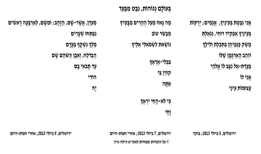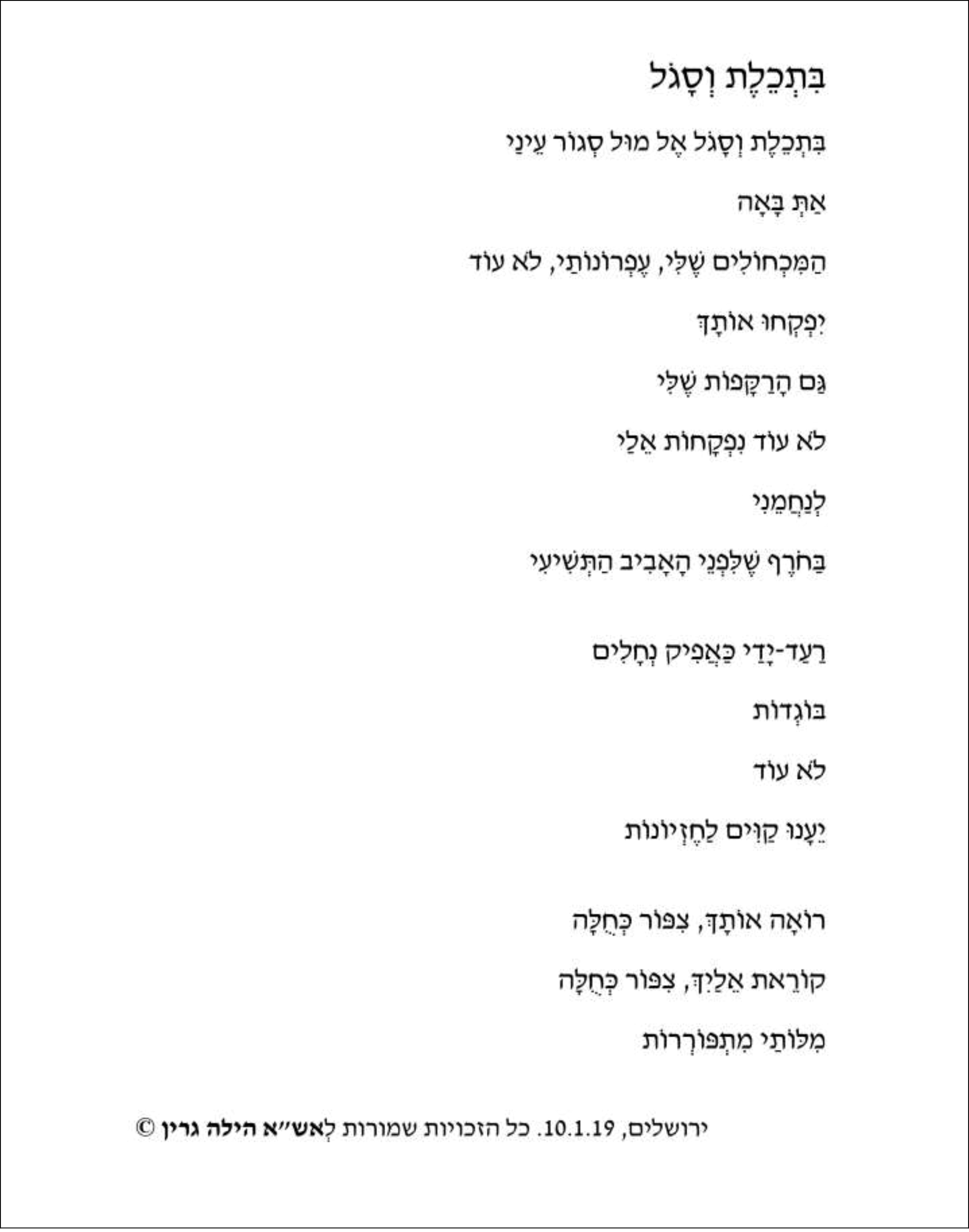 והוספתי: ואת העיניים מחלום הציפור הסגולה הרי חתכתי החוצה אז לאייר את השיר שלה שכמו כתב אותי אליךָ, וכמה השתאינו שתינו כשנוכחנו; אבל אתה כבר מעבר לתנועת הזמן ואולי חייכתָ, שָׁקֵט וזך כמו בַּשׁוּרוֹת שלה ורק אני מתערבֶּלֶת במעמקֶיךָ, לרגע נִשּאת על מֵימֵיךָ ושבה וצוללת בָּם