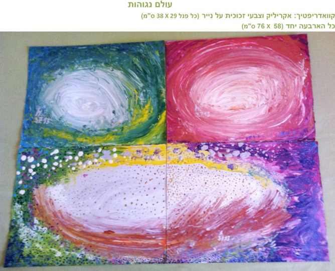 הטריפטיך עוֹלָם נְגוֹהוֹת (בְּזָהָב) וכן שְׁנֵי הַפָּנֶלִים העליונים מתוך הקוואדריפטיך עוֹלָם נְגוֹהוֹת, אשר צוירו בהזדמנויות שונות, הוצגו בתערוכה בתיאטרון ירושלים בשנת 2014