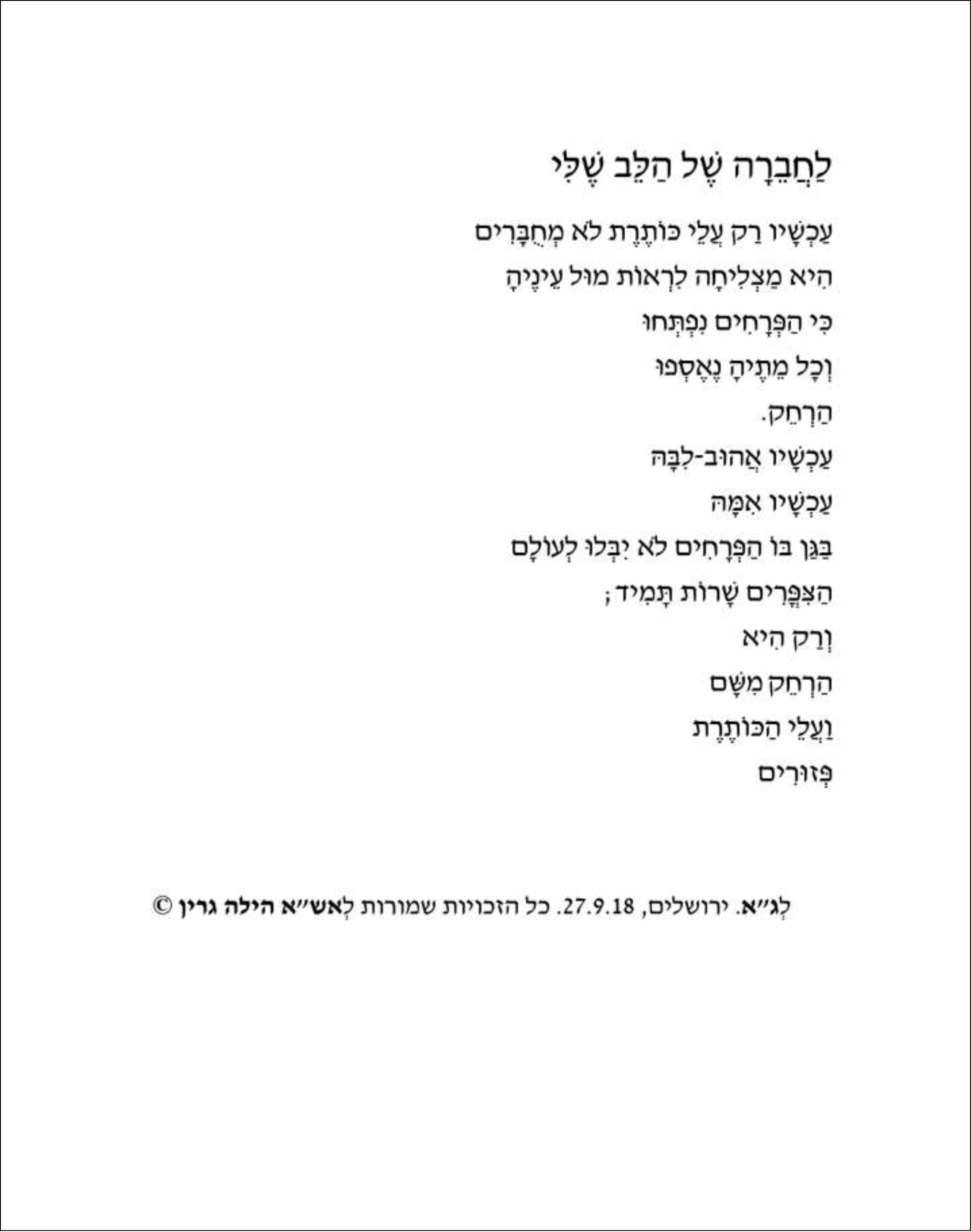 הפעם לא אני אחפור וְאטמין וַאֲכַסֶּה; הִשְׁאַרְתּי שָׁם אֶת התשלום, וְהוא ישלח לי – כך הווטרינר הבטיח – צילומים מִשָּׁם. שלה, עטופה בציפית הישנה שֶׁלקחנו מִבֵּית אִמְּךָ אחרֵי שֶׁנפטרה, הַאִם אתה זוכר, אהובי? לפנֵי, ואחרֵי, שֶׁיַּטְמִין אותה