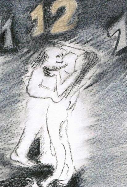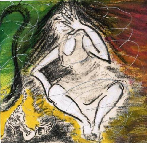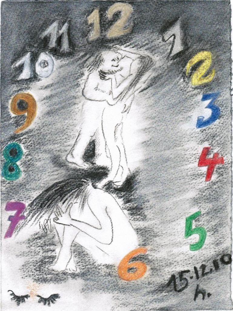 ביום 15.12.10 ציירתי, בעיקר פחם, ורק הספרות שעל פני לוח-השעות בעפרונות דיו צבעוניים; והעליתי בפייסבוק, כבר ב”דף ההמשך”, אחרי שסגרו את הדף של אלן שלי, וכתבתי: ג’וני מיטשל שרה עכשיו “קְרָא לה גרין…”, חוזרת ומשמיעה ברצף. “והחורפים לא יוכלו לְעַמְעֵם אותה… ולעיתים יהיה צער“… החלומות הישָנים כל כך חוזרים אליי אחרֵי כל השנים האלו, אֹשֶׁר שלי שֶׁאָבַדְתָּ לי מכאן, מתערבְּבִים עם גַּעְגּוּעַי אליךָ. ציירתי אותךָ בעתידךָ, ציירתָ אותי בהווה שלא היה של שְׁנֵינוּ. קוד הצבעים של השעון מפגיע בי לזכור; ובחלומי שמאז את פָּנֶיהָ, מִצחהּ נוגע ברצפה וּשְׂעָרָהּ כהה ארוך בּוֹכָה את אובדנךָ, לא ראיתי